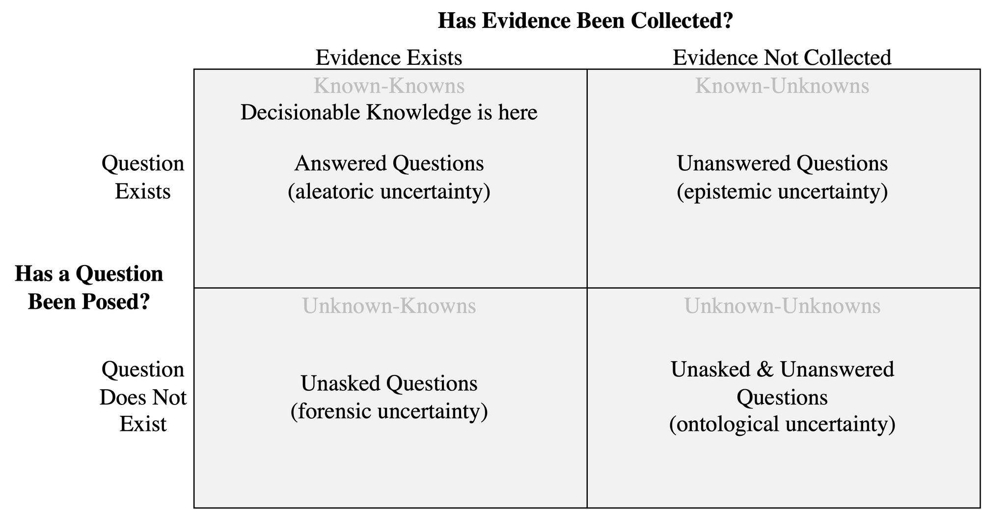 These are questions that have been both articulated and resolved with evidence. This quadrant represents existing knowledge. There is often residual uncertainty related to quantitative knowledge that is irreducible, i.e., Aleatoric Uncertainty.