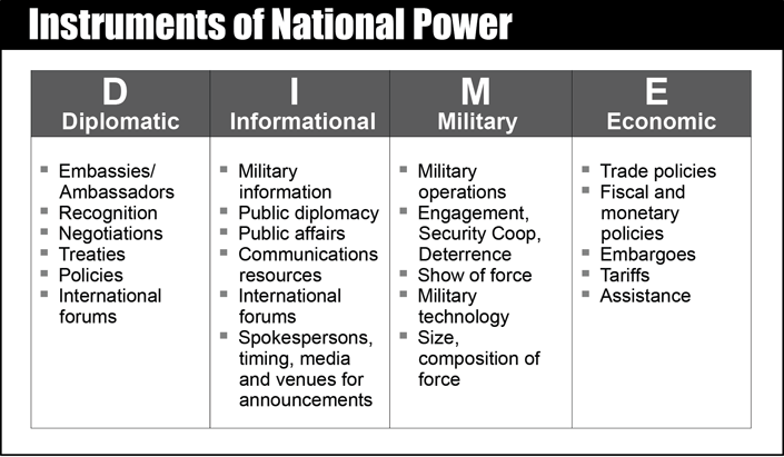 Using the DIME framework, planners and strategists can consider how to build a strategy to achieve a specific outcome with regards to national prosperity and security.